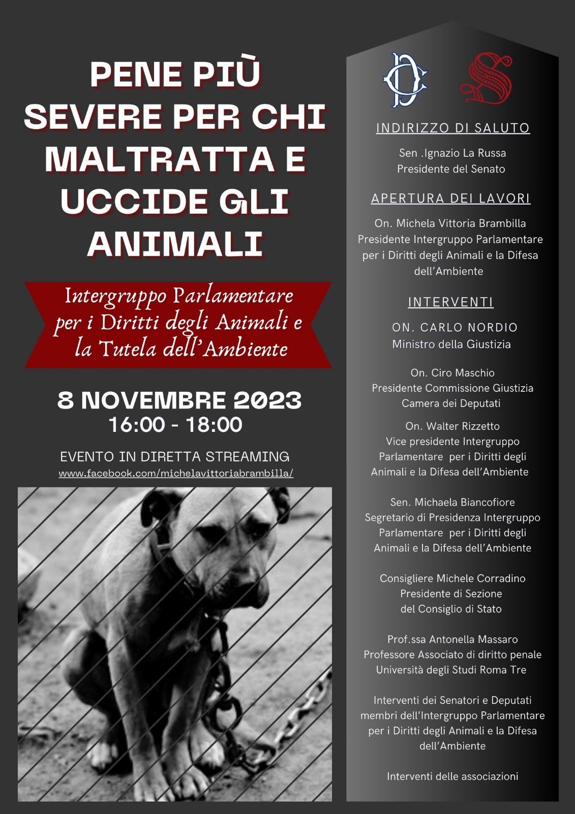 Risorge la Brambillotta Evviva, dopo tre mesi di assenza dai Palazzi romani, riecco spuntare la Brambillotta attesa per oggi ad un Convegno in Senato. Come ogni parlamentare si rispetti, la Brambillotta, a nome dell'Intergruppo parlamentare che presiede, si esalterà nell'illustrare la sua proposta di legge ferma in Commissione Giustizia dalla fine di luglio. Dalle 16 è possibile seguire il convegno da questo collegamento; il convegno è incentrato su “Pene più severe per chi maltratta e uccide gli animali” ed occorrerà segurlo per capire se ci saranno, come al solito, attacchi a Siena. Che strane combinazioni avvengono in attesa del dpcm di Giorgina sulle illegittime regole relative a Siena e agli scimmiottamenti. 8 novembre 2023