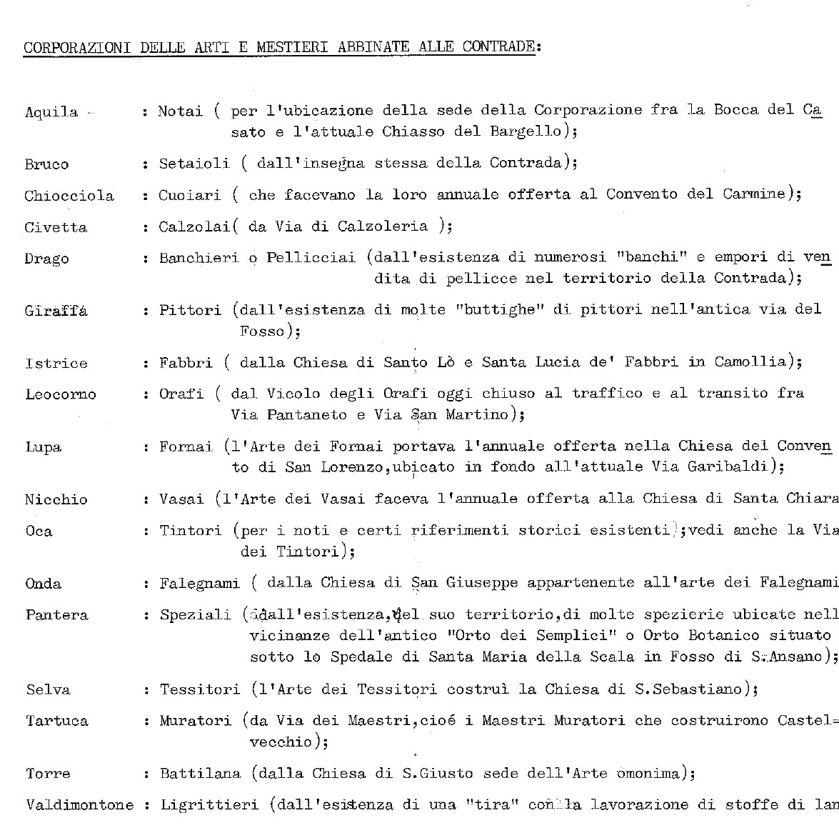 Le patacche del rinnovo 1981 Le patacche del corteo, con il preciso scopo di abbellire per i forestieri la passeggiata sul tufo, hanno inizio nel 1904 con le prime due Contrade cosiddette dalla leggenda "soppresse" ad entrare nel tufo; nel 1928 arriva il resto del quartetto. L'esplosione della patacche si ebbe, però, nel 1981 con inserimenti veramente vergognosi, come quello dello Studio senese e delle Famiglie nobili. Ci fu anche la patacca che riguardava le arti attribuite a casaccio alle 17 Contrade. Per rendere chiaro quanto fossero false le attribuzioni, l'archivio Sunto ripropone lo schema e la motivazione di ciò che vediamo oggi sfilare, in modo nalacronistico, davanti al rispettivo popolino di Contrada. Ecco il documento ed il lettore può trarre le dovute conclusioni:
